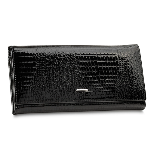 Duży portfel damski skórzany czarny marki DIAMOND z kolekcji ONYX to elegancki i funkcjonalny dodatek zaprojektowany z myślą o kobietach, które cenią styl oraz perfekcyjną organizację. Wykonany z wysokiej jakości skóry naturalnej lakierowanej, zachwyca subtelnym połyskiem i odpornością na codzienne użytkowanie. Portfel jest zamykany na magnes, co zapewnia wygodne i szybkie otwieranie oraz bezpieczne przechowywanie zawartości. To model, który łączy modowy charakter z praktycznymi rozwiązaniami. Lakierowana powierzchnia nadaje portfelowi wyrafinowany wygląd, a solidne wykonanie zapewnia trwałość na lata. Dzięki zastosowaniu innowacyjnej podszewki z ochroną RFID możesz bezpiecznie przechowywać karty płatnicze, bez obaw o nieautoryzowane skanowanie danych.