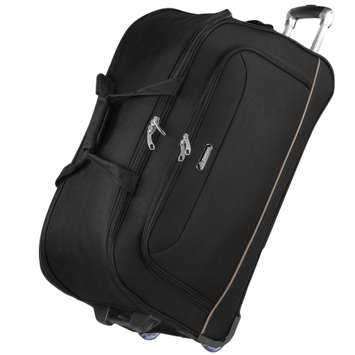Komfort użytkowania zwiększają dwa duże kauczukowe kółka osadzone na metalowych łożyskach, które zapewniają płynne i ciche prowadzenie nawet przy pełnym obciążeniu. Usztywniane dno oraz solidne zabezpieczenia rogów torby wzmacniają konstrukcję i chronią ją przed uszkodzeniami mechanicznymi. Dwupoziomowy, teleskopowy uchwyt umożliwia wygodne manewrowanie torbą, a miękkie uchwyty spinane rzepem pozwalają komfortowo przenosić ją w ręku. Wnętrze torby zostało zaprojektowane w sposób funkcjonalny – wyposażono je w dwie praktyczne kieszonki wewnętrzne oraz elastyczne pasy spinające bagaż, stabilizujące zawartość podczas transportu. Model posiada również pojemną kieszeń zewnętrzną na podręczne przedmioty.