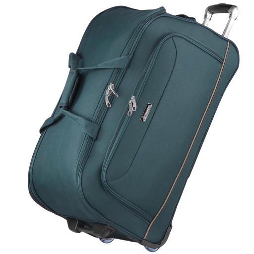 Komfort użytkowania zwiększają dwa duże kauczukowe kółka osadzone na metalowych łożyskach, które zapewniają płynne i ciche prowadzenie nawet przy pełnym obciążeniu. Usztywniane dno oraz solidne zabezpieczenia rogów torby wzmacniają konstrukcję i chronią ją przed uszkodzeniami mechanicznymi. Dwupoziomowy, teleskopowy uchwyt umożliwia wygodne manewrowanie torbą, a miękkie uchwyty spinane rzepem pozwalają komfortowo przenosić ją w ręku. Wnętrze torby zostało zaprojektowane w sposób funkcjonalny – wyposażono je w dwie praktyczne kieszonki wewnętrzne oraz elastyczne pasy spinające bagaż, stabilizujące zawartość podczas transportu. Model posiada również pojemną kieszeń zewnętrzną na podręczne przedmioty.