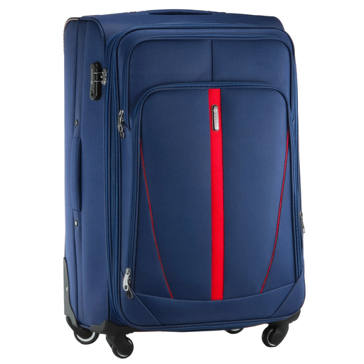 Walizka duża miękka granatowa marki DIAMOND z kolekcji RUBY. Jej najtrwalszym atutem jest zastosowanie materiału Codura 1200D, gwarantującego wyjątkową wytrzymałość i trwałość. Dzięki 4 dużym kauczukowym kółkom na solidnych metalowych łożyskach przemieszczanie się jest nie tylko łatwe, ale także ciche, nawet na nierównym terenie. Dodatkowe zabezpieczenie narożników walizki sprawia, że jest ona odporna na uderzenia i przypadkowe uszkodzenia, chroniąc zawartość przed wszelkimi nieprzewidzianymi sytuacjami. Tworzywo, z którego została wykonana, jest nieprzemakalne, co oznacza, że nawet w trudnych warunkach atmosferycznych bagaż pozostaje suchy i bezpieczny.