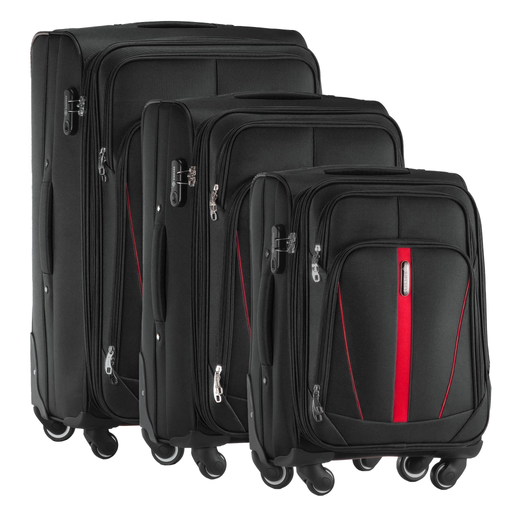 Zestaw 3 walizek materiałowych czarny z kolekcji RUBY, który został stworzony dla wymagających podróżników. W skład zestawu wchodzą walizki we wszystkich dostępnych rozmiarach: XL (28"), M (24") oraz S (20"). Głównym atutem tych walizek jest zastosowanie wysokogatunkowego materiału Codura 1200D, co gwarantuje niezwykłą trwałość i odporność na wszelkie warunki atmosferyczne. Manewrowanie walizkami jest nie tylko łatwe, lecz także ciche, dzięki zastosowaniu czterech dużych kauczukowych kółek, na solidnych metalowych łożyskach.