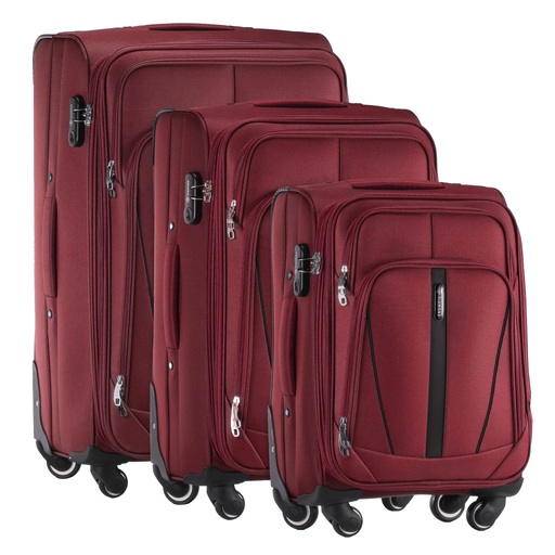 Zestaw 3 walizek materiałowych czerwony z kolekcji RUBY, który został stworzony dla wymagających podróżników. W skład zestawu wchodzą walizki we wszystkich dostępnych rozmiarach: XL (28"), M (24") oraz S (20"). Głównym atutem tych walizek jest zastosowanie wysokogatunkowego materiału Codura 1200D, co gwarantuje niezwykłą trwałość i odporność na wszelkie warunki atmosferyczne. Manewrowanie walizkami jest nie tylko łatwe, lecz także ciche, dzięki zastosowaniu czterech dużych kauczukowych kółek, na solidnych metalowych łożyskach.