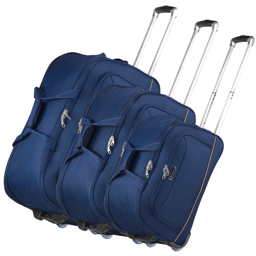 Wszystkie torby wyposażono w kauczukowe kółka osadzone na metalowych łożyskach, które gwarantują płynne i stabilne prowadzenie bez względu na rodzaj nawierzchni. Usztywnione dna i zabezpieczenia narożników zwiększają trwałość konstrukcji i chronią bagaż przed uszkodzeniami. Zestaw zapewnia pełną funkcjonalność dzięki dwupoziomowym teleskopowym uchwytom, wygodnym rączkom spinanym na rzepy oraz zewnętrznym kieszeniom, ułatwiającym organizację.